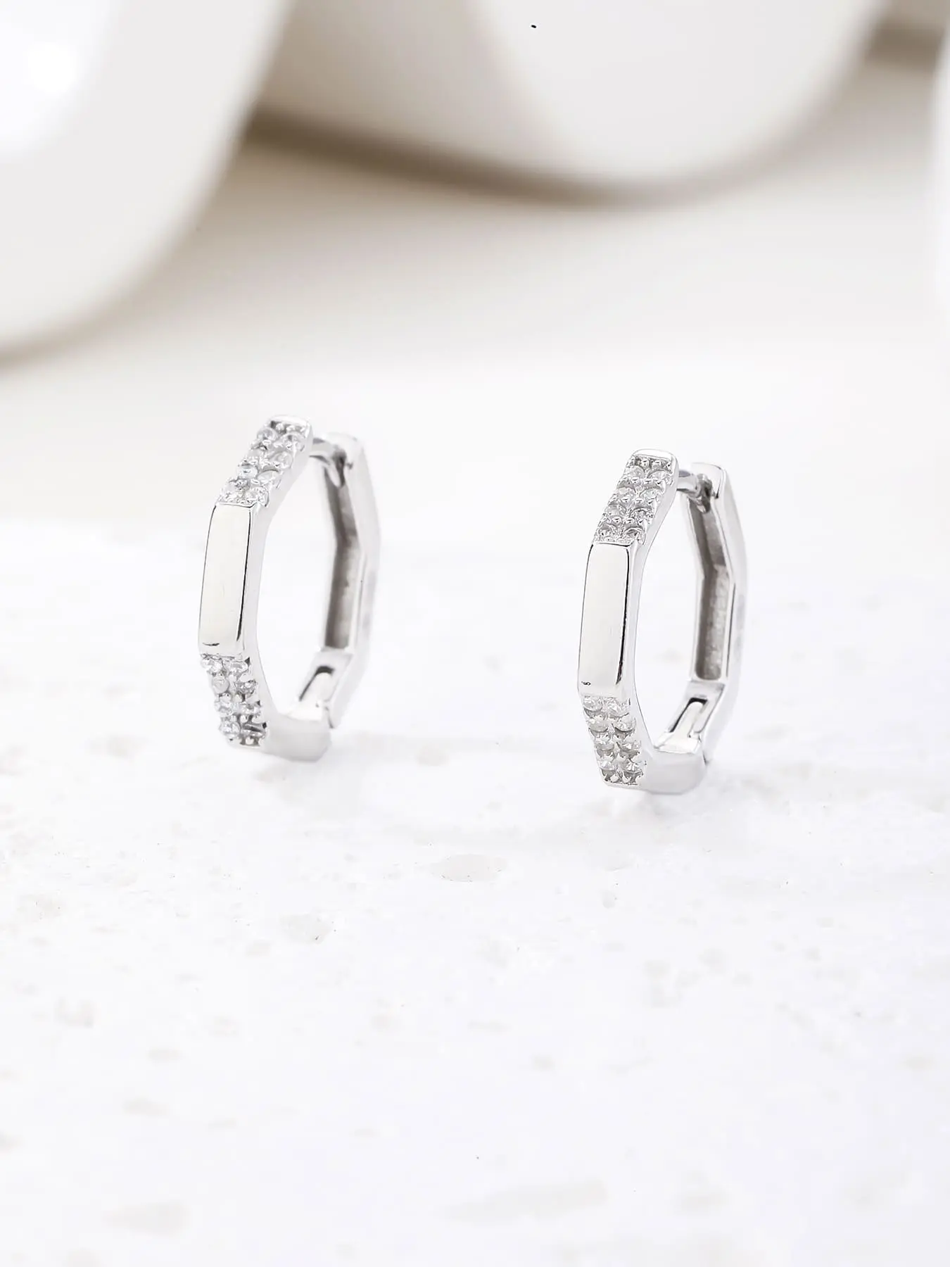 Dieser moderne achteckige Ohrring aus 925er Sterlingsilber ist mit eleganten weißen Steinen verziert, die in einem besonderen Glanz erstrahlen. Seine klaren Linien vereinen harmonisch zeitgenössisches Design mit klassischem Glamour.