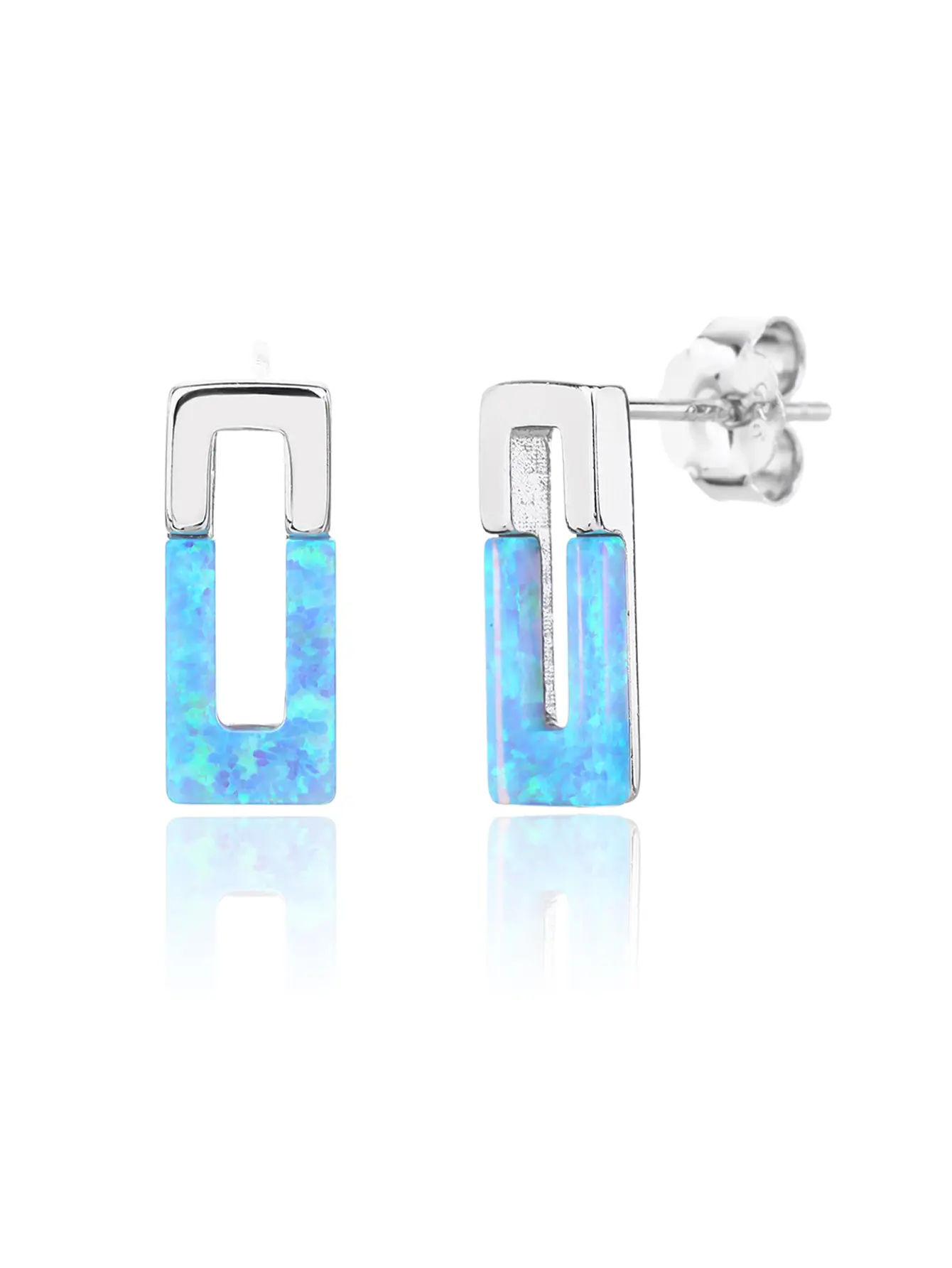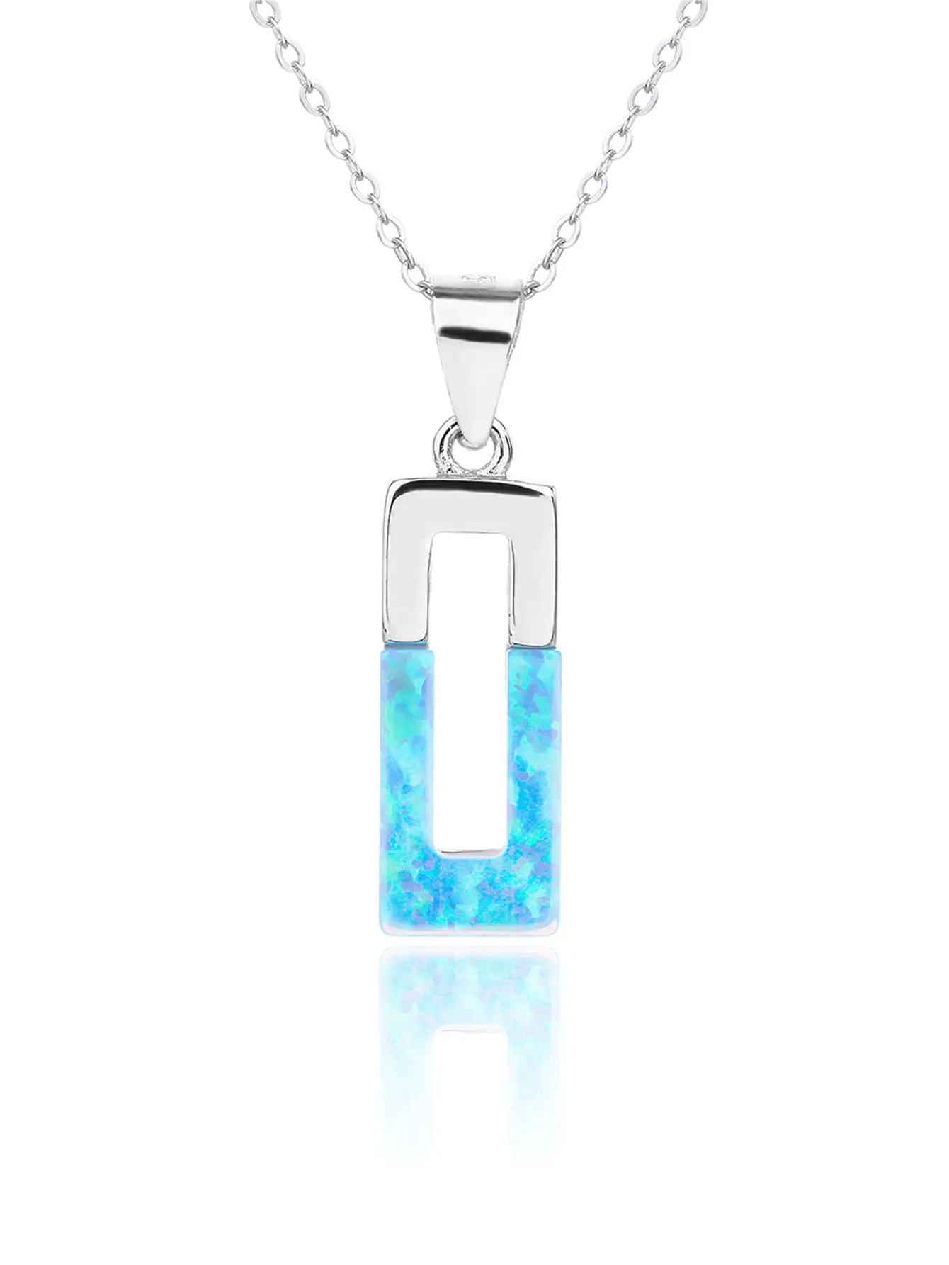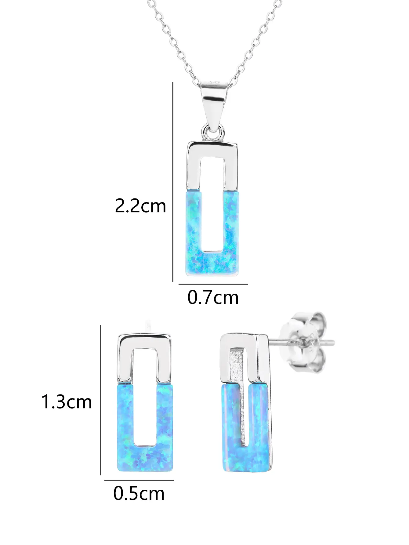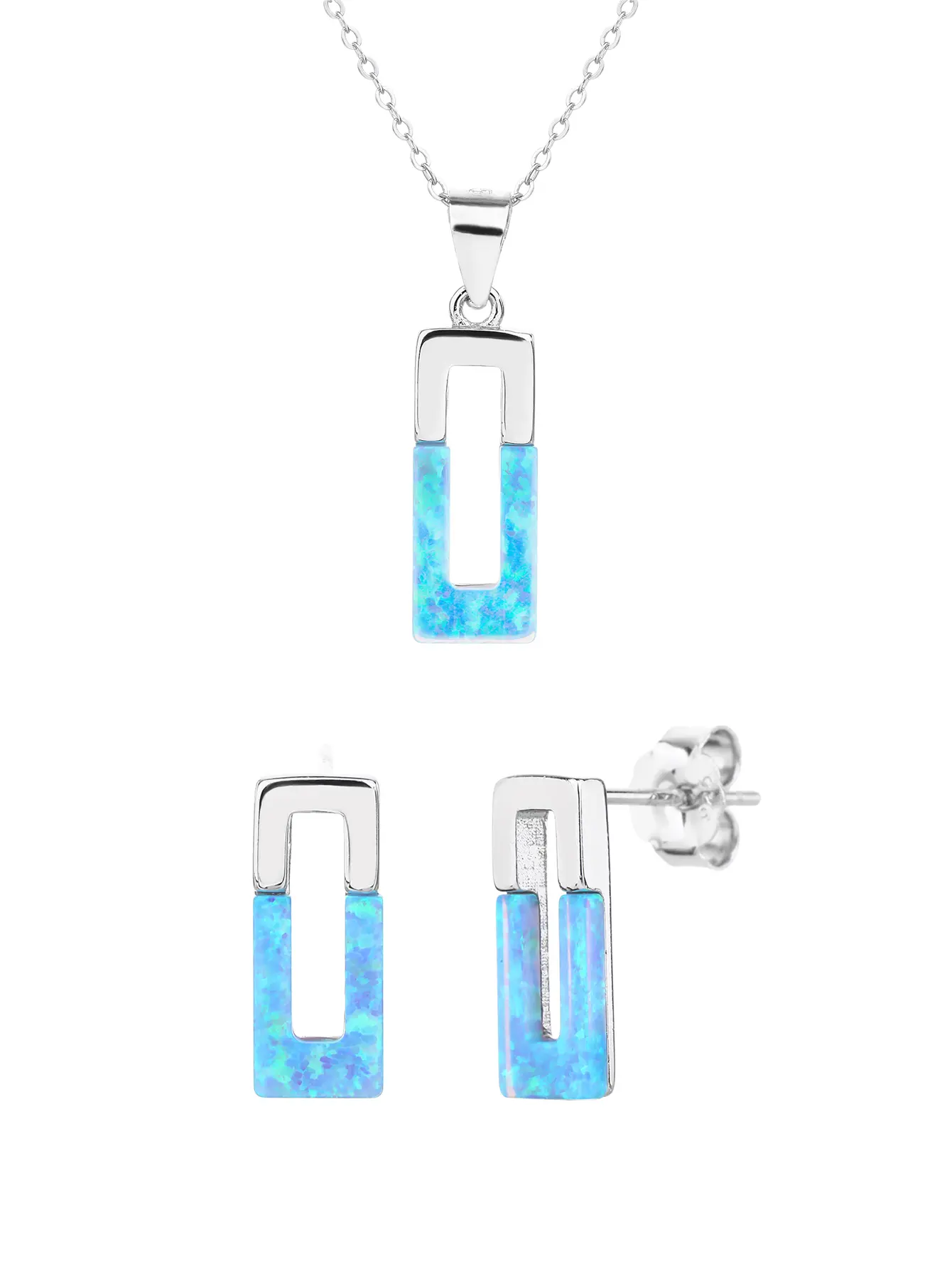 Ez a kifinomult ezüst ékszerszett világoskék, csillogó opálbetétekkel díszített. A geometrikus formavilág különleges karakter ad a daraboknak szögletes fémet, ezért a AG925-ös sterling ezüst fényessége elegáns keretet biztosít a fénylő opálnak. A medálhoz nem tartozik lánc – így saját kedvenceddel kombinálhatod.