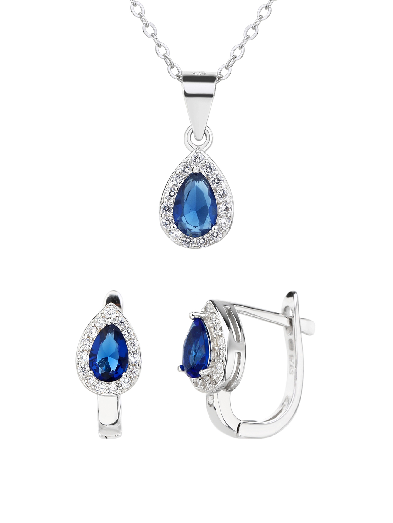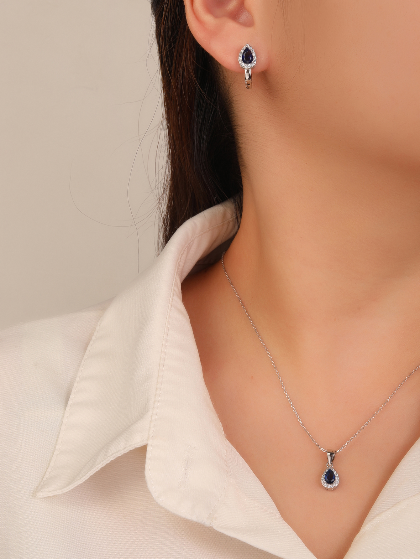 The drop-shaped, deeply shimmering stone and the surrounding white zirconia stones create a dazzling contrast. The set includes the pendant and earrings, with the chain available separately.