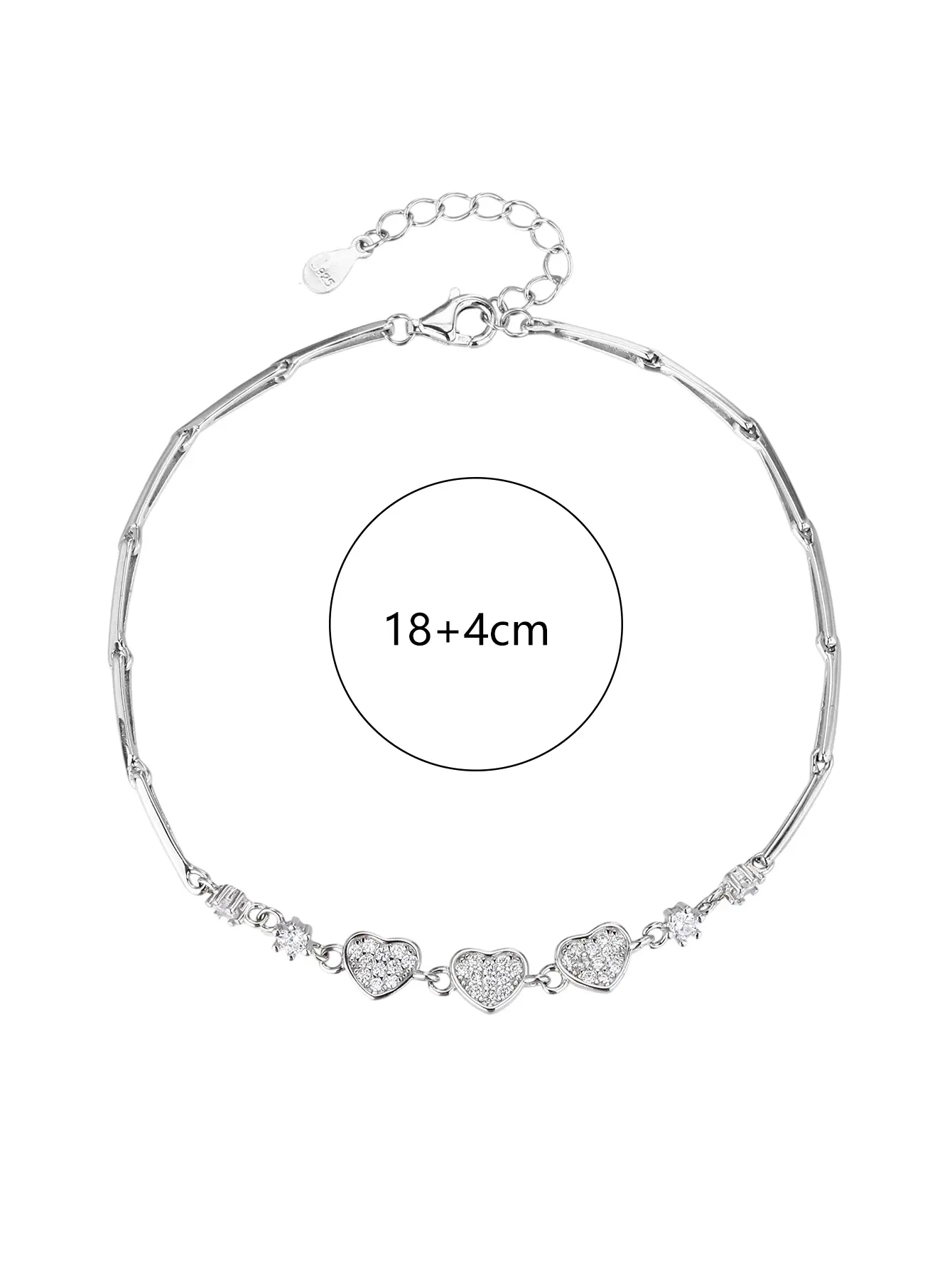 This special bracelet, adjustable in length from 18+4 cm, is adorned with three shimmering cubic zirconia hearts, symbols of love, harmony and happiness. Delicate links and tiny stones elegantly frame the heart motifs, making this bracelet both romantic and sophisticated jewellery.